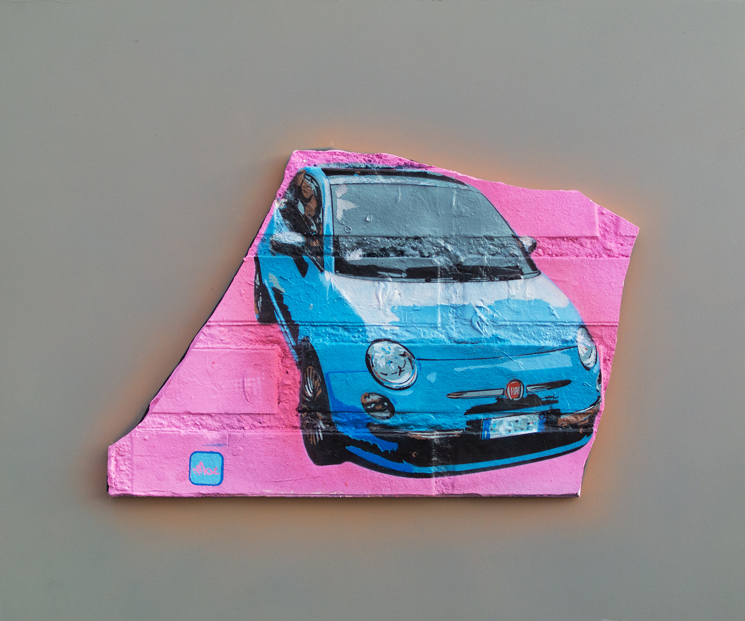 Acrylics, sprays and stencils “tell” places, brands and colors of the New World in which Vespa, Fiat 500, Coca Cola and Nike become icons of a style, of an American style. Symbols of a pop culture and consumerism, where the real protagonists of the scene are things and not people. In Dodge, 500, Nike and Porsche pop objects are represented with street art and become interior design elements, from the street they enter the house through a resin cast of the wall.
